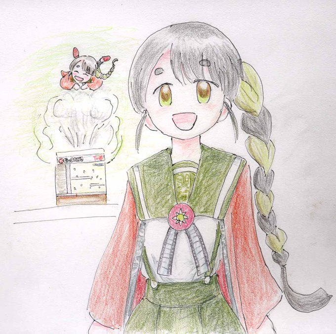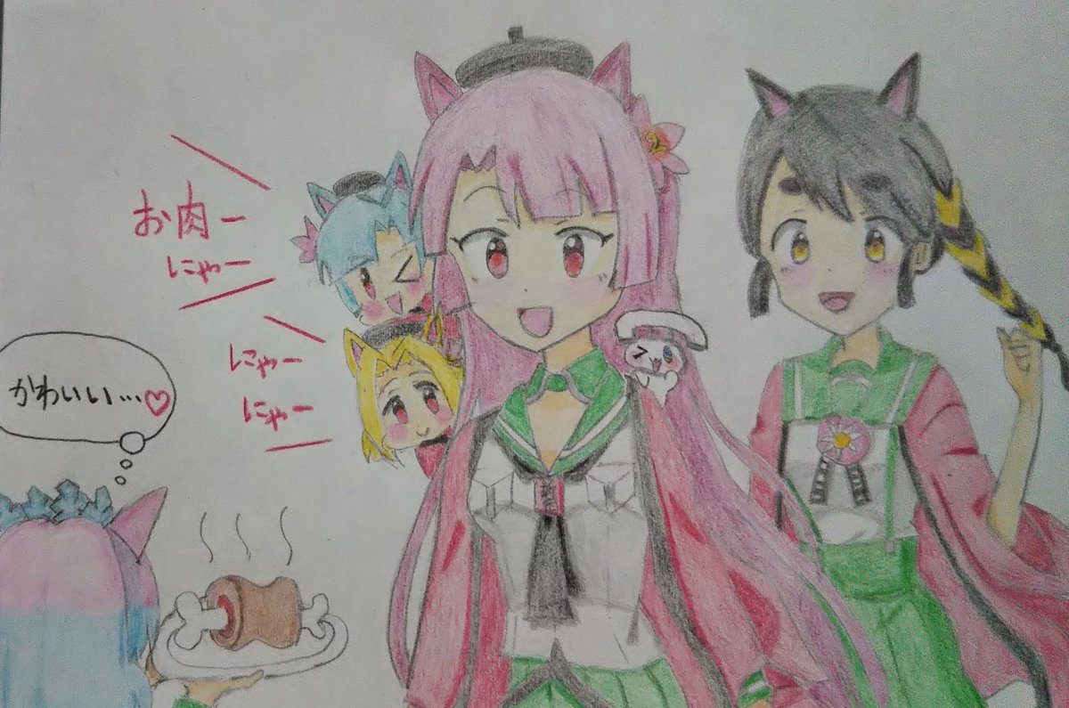 #9月27日は調布たん擬人化5周年 #9月27日はしんじゅくたんのバースデー お祝いにイラストを描きました! #しんじゅくたん 、 #調布たん 、おめでとうございます! にゃー🎉(≧▽≦)🍖🐈️ #さがみたん #新宿西口たん #新東たん #ビッカメ娘 ( #ナイセン ) #ビッカメ娘を描き隊 #ファンアート #色鉛筆