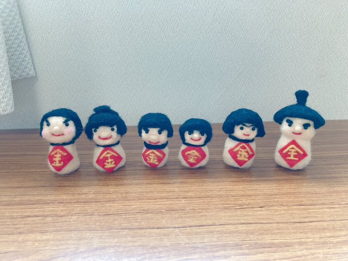 #田園調布グリーンコミュニティ 羊毛フェルト講習会 今月の作品は、こどもの日に向けて、 キリッと眉毛の金太郎 。 きちんと並んで集合写真の後は、金太郎サミット?! 「俺たち、みんなちがって、みんないいよな!」って言っているのかな? #羊毛フェルト #講習会 #金太郎 #Rookの仲間たち