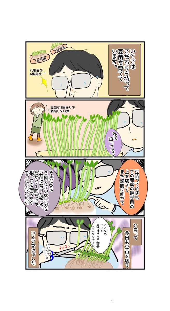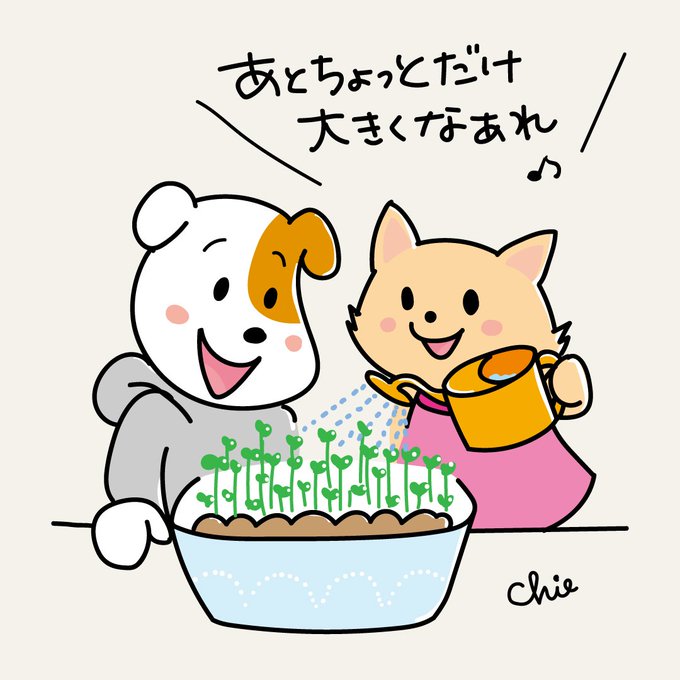 1月16日「豆苗への愛着」 2回目を育ててるけど 早くのびるのと少しずつのびるのあって、なんか可愛くて愛着が…🌱 #豆苗 #ちゅっちゃんの毎日 #イラスト #illustration #1日1絵