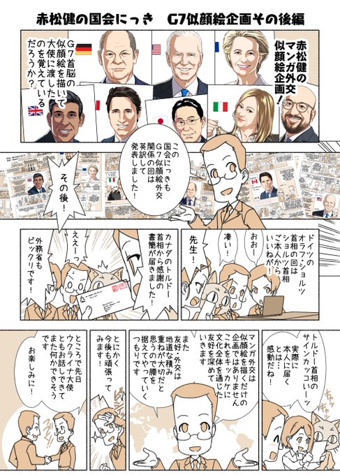 #赤松健の国会にっき (月・水・金曜に更新中) (133)G7似顔絵企画その後 編 似顔絵は、どの国であっても「見た瞬間に笑ったり驚いたりしてもらえる」のが超強いです。文化(とスポーツ)に国境は無いと感じる瞬間です。これを平和や友好に活かさない手は無いと感じます
