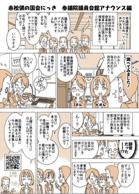 #赤松健の国会にっき (月・水・金曜に更新中) (135)参議院議員会館アナウンス 編 議員や秘書の他にも、国会には会議を運営面でサポートしたり、政策立法を支援したり、広報や警務を行う公務員さんたちが大勢います。議員以外の形で国会に関わりたい方は、参議院事務局を調べてみると良いかも!
