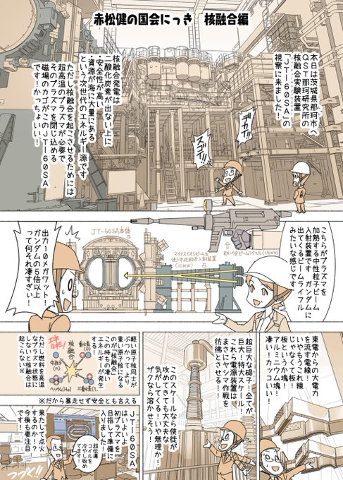 #赤松健の国会にっき (月・水・金曜に更新中) (136)核融合 編 那珂研究所の視察中はずっと、エヴァンゲリオンの例のBGMが頭の中で流れてました👼 4コマ目の「碍子(がいし)」ですが、近年ブラタモリで有名になりましたね。電柱&電線とかに付いている陶磁器っぽいアレです。