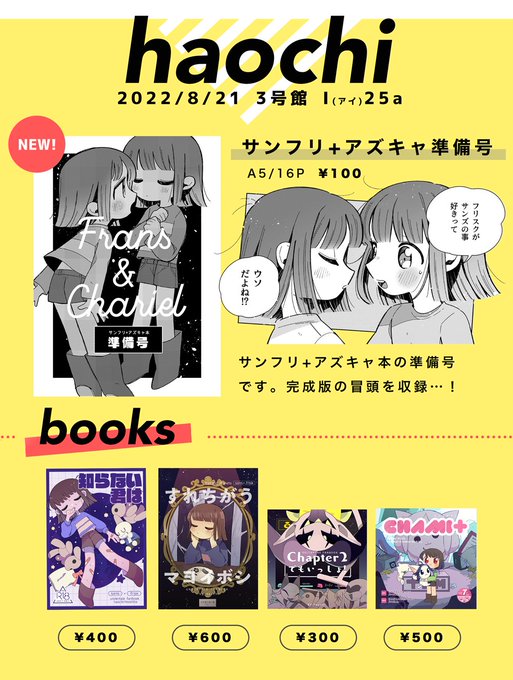 *SUPER COMIC CITY 関西 28 『8/21 超きみの選択。2022夏』のお品書きです! ろこちゃん(@korokor59513559 )とニトロちゃん(@kurage20210922 )の委託グッズも置いています! 【3号館l 10b】にてお待ちしております💓 よろしくお願いします〜!✨ #超きみの選択2022夏 #UTdr同人