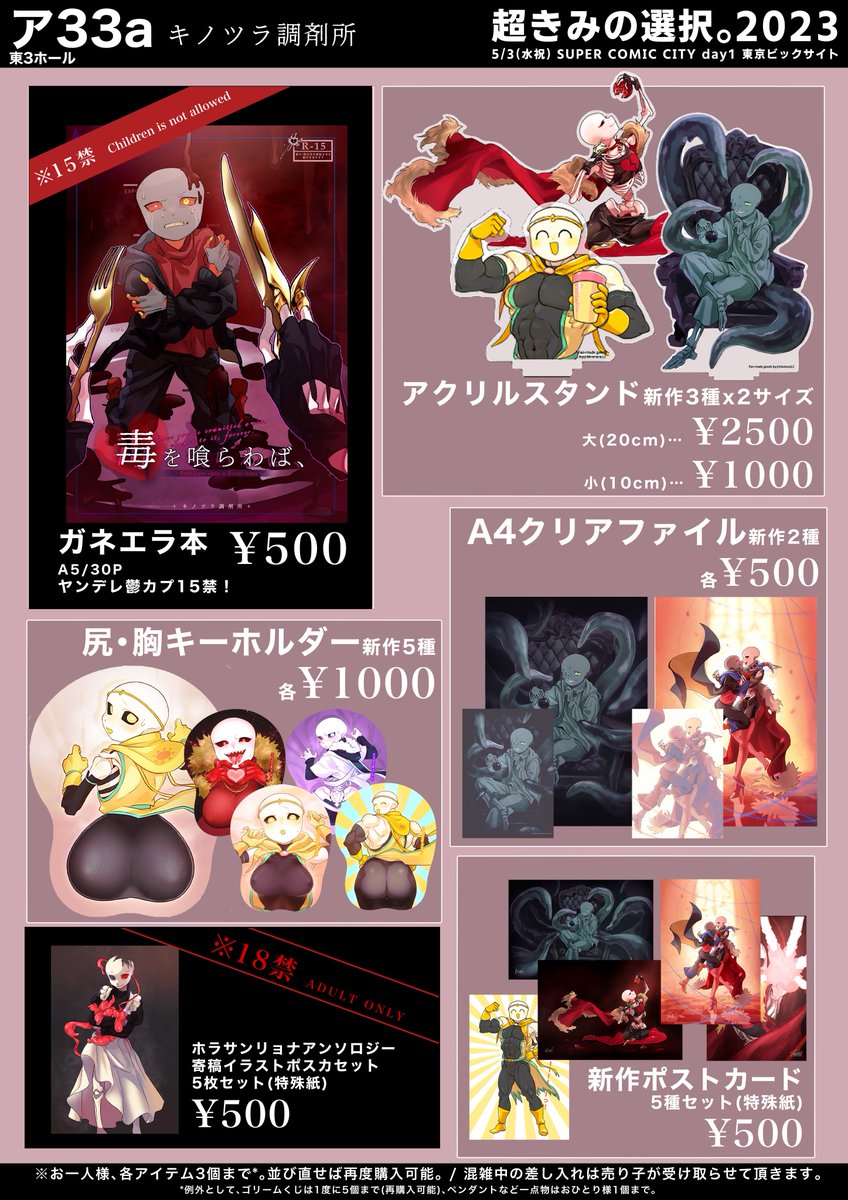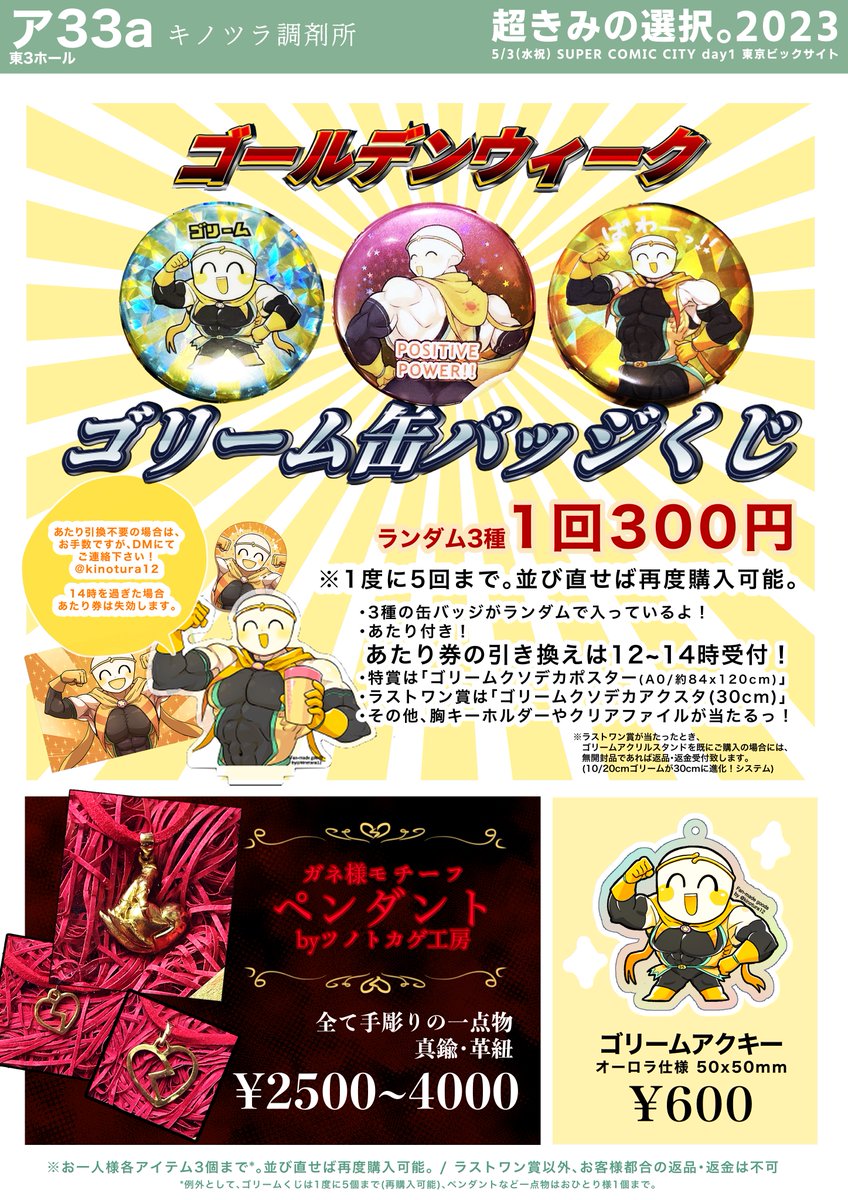 キノツラ調剤所、5月3日は東3ホールア33aにてお待ちしております! 各種AUのアクスタ、尻胸キーホルダー、クリアファイル、ポストカード、そしてゴリーム君のクソデカポスターが当たる缶バッジくじなど盛り沢山の予定です!どうぞ宜しくお願い申し上げます! #超きみの選択2023 #AUプチオンリー2023_5