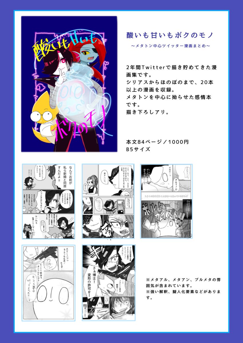 こちらの誠行さんのサークル様の売り子として、明日参加させていただけることになりました! 少数部ですが、メタトン中心漫画本とナプスタブルーク中心イラスト本を並べさせていただきます!おまけでシールもつくかも! 久しぶりのアンテサークル側参加だ!よろしくお願いします! #超きみの選択2023 twitter.com/temmiethemoney…