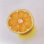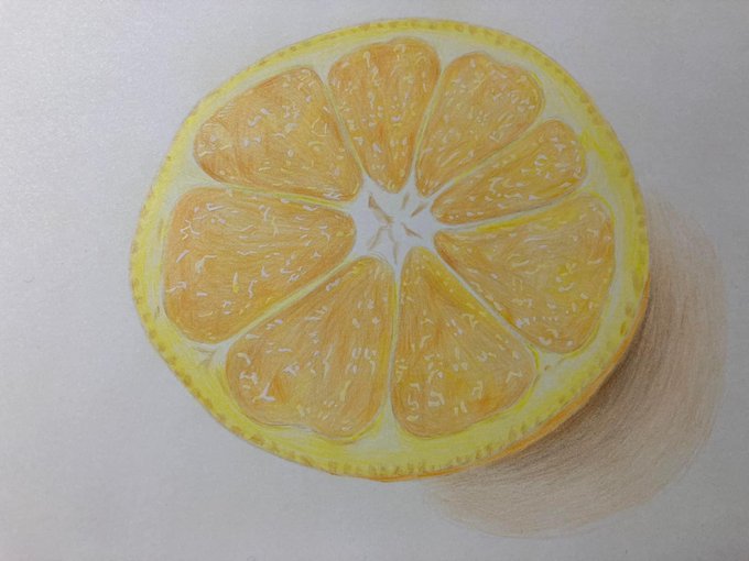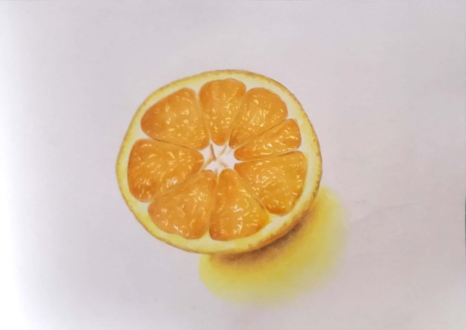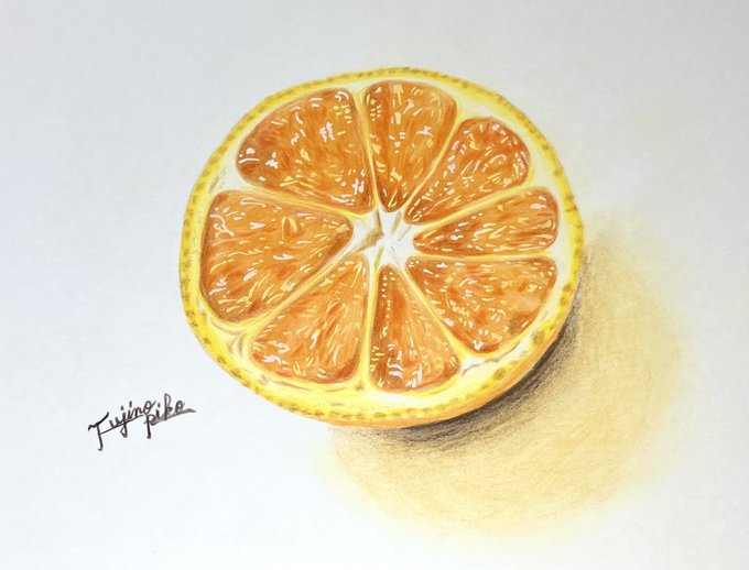 オレンジを描きました🍊 こちらの本をみながら描きました✨ とても細かく説明が書いてありとても勉強になりますよ😁 おすすめです✨ これで初級、ここまるさん天才✨ 僕もまだまだ勉強するぞー!✏️ @Cocomaru_S #色鉛筆 #超絶リアルな色鉛筆画のテクニック #イラスト