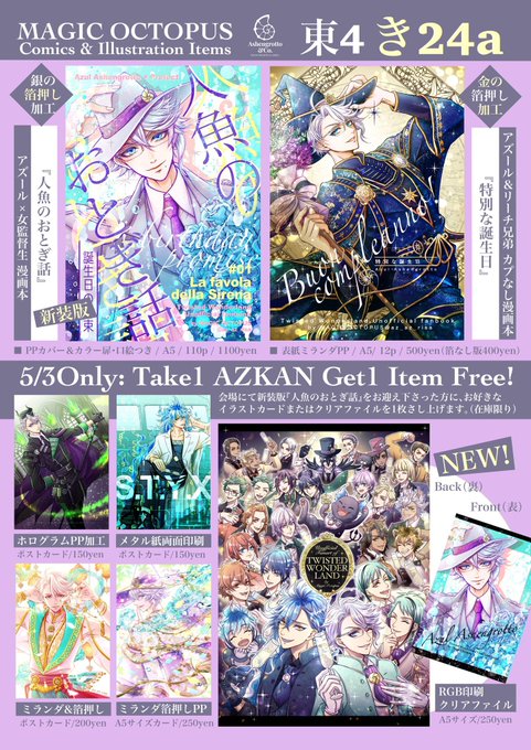 5/3 #超BeckonoftheMirror2023 おしながき🪞会場にてアズ監漫画『人魚のおとぎ話』をお迎え下さった方に、お好きなポストカードorクリアファイルを差し上げます🎁(グッズ単体頒布もします) 人魚のおとぎ話🌸漫画sample ecs.toranoana.jp/joshi/ec/item/… 特別な誕生日🎂漫画sample ecs.toranoana.jp/joshi/ec/item/…