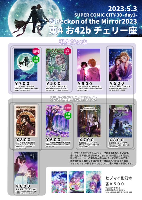 5/3スパコミお品書きです! 【東4お42b チェリー座】 新刊はリリア+ケイト作品集。漫画は引用ツイ参照。 既刊は🐉+🦇、紅銀親子など。ドムサブ本有。🎤乱幻本も持ち込みます。 よろしくお願いします🍒 pixiv☞ pixiv.net/artworks/10762… 通販☞ ecs.toranoana.jp/joshi/ec/cot/c… #超BeckonoftheMirror2023 twitter.com/ruca_twilight/…