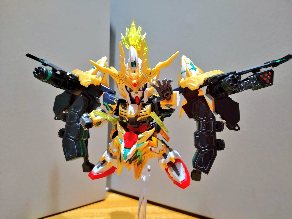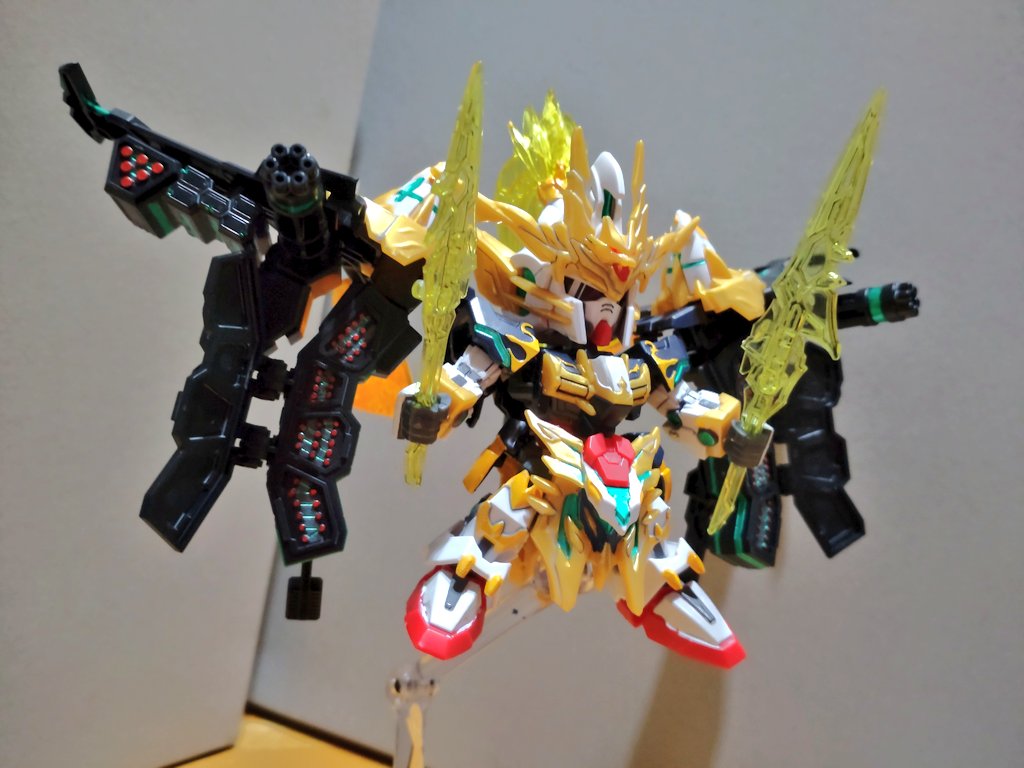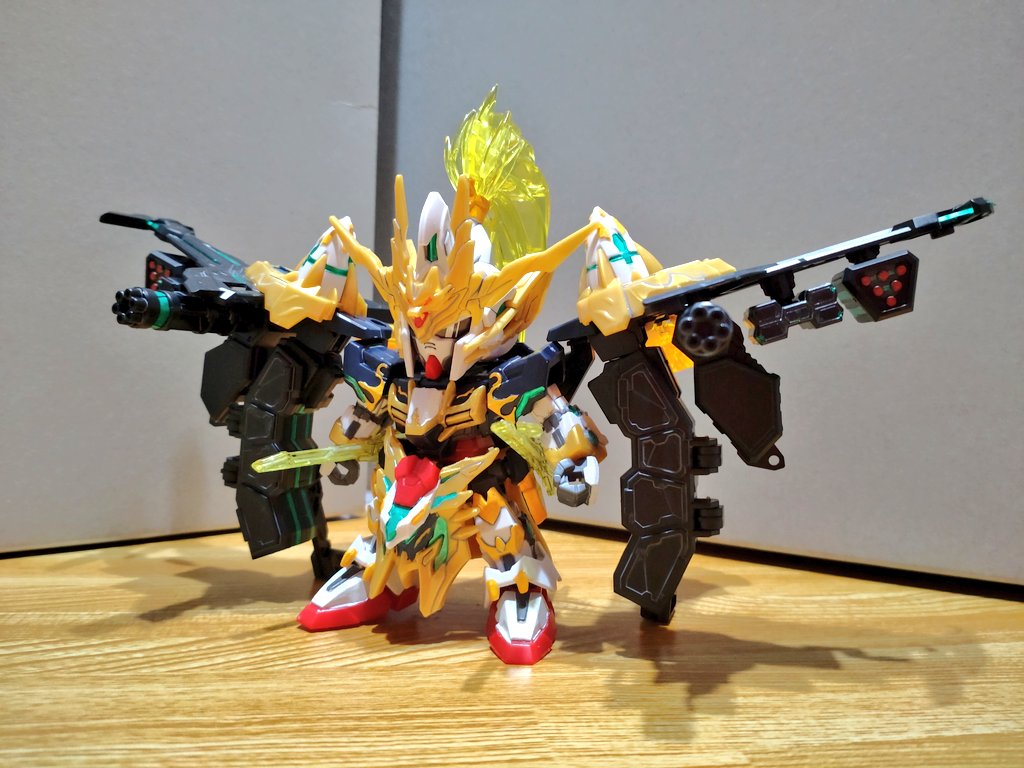 (1/4) #趙雲ダブルオーガンダムコマンドパッケージ 完成 オーライザーモチーフの追加パーツでかなりゴツくなったけど、支柱がついてるから安定して自立可能 グラサンは欲しかったから助かる (リプ続↓) #ガンプラ #SDGW #SDGW_DK #俺SD作ってるぜ #SDガンダム #ガンプラの画像貼るとRTされると聞いて