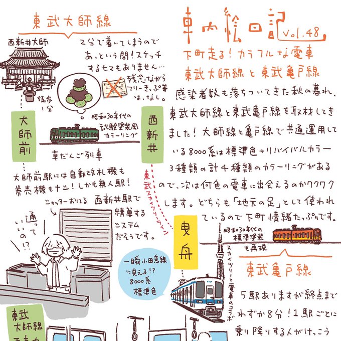 雑誌『旅と鉄道 9月号』(山と渓谷社)に、連載「車内絵日記Vol.51:乗る理由は人それぞれ!見どころいっぱいシーサイドライン」掲載。 自動運転の #金沢シーサイドライン では「かぶりつき席」でジェットコースター気分を味わえます👍 #旅と鉄道 #車内絵日記 #横浜 #イラスト #AdobeFresco