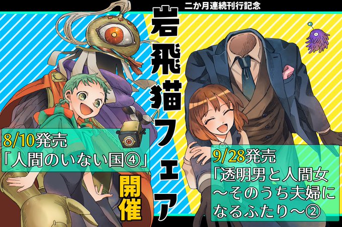 🐱活動内容🐱【固定用】 【#人間のいない国】 試し読み(twitter.com/iwawotobuneko/…) 通販・電子書籍(futabasha.co.jp/book/978457585…) 【#透明男と人間女】 試し読み(comic.pixiv.net/works/7716) 通販・電子書籍(futabasha.co.jp/book/978457544…) 双葉社岩飛猫公式アカウント→twitter.com/iwatobinekoFTB #岩飛猫