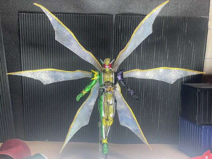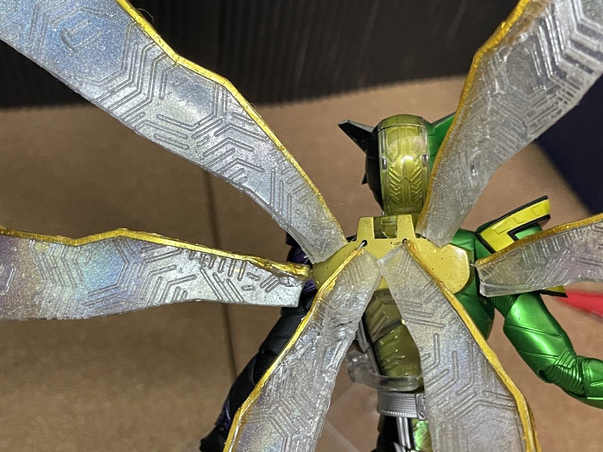 真骨彫 仮面ライダーW サイクロンジョーカーゴールドエクストリーム 作成しました。 生物チックな羽がゴールドエクストリームの中で好きな箇所なので複製して可動できるようにしてみました。 ホログラム塗装をすることで角度によって光ります #ニチアサフィギュア改造部 #造ってあそぼ