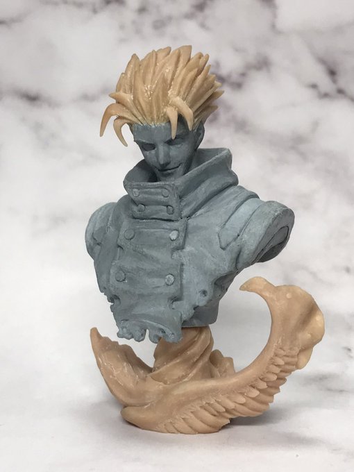 その過渡期を思わせるトライガンガチャの試作モデルを発掘したw 体と服がファンドで髪の毛がスカルピーだ。 これは試作でその後の最遊記から始まる僕のガチャガチャ原型は全てスカルピーとなる。 僕の最初のガチャ原型は最遊記胸像だった。 そのあとトライガン胸像。 #造形師デビュー25周年
