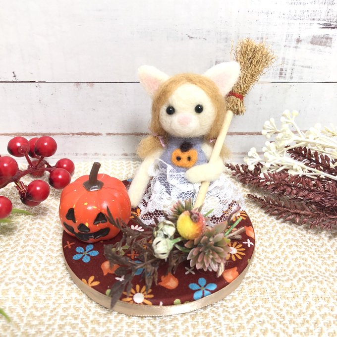 羊毛フェルトの作品も続けて作ってます くろねこさんのハロウィンパーティーは、ジャックオランタンのバケツからおばけちゃんが飛び出してきます🎃 minne.com/@hare-gumi #minne_new #minne #アーティフィシャルフラワー #造花 #ハロウィン #ジャックオランタン #羊毛フェルト #雑貨 #リース