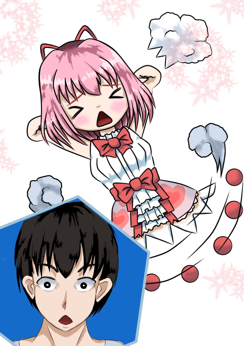 恋愛「確かに、モブ男くんの分際でハーレム王?バカなの?ねぇ〜、バカなの?」 恋愛「って思ったけど!なんで僕だけ可愛くないんだよぉ〜。ひどいよ〜!訴えてやる〜!」 ミュウ「暴れないで、冗談だってば師匠〜!!」 おしまい #フラグちゃんed #Illustration #plotAnime #連作イラスト