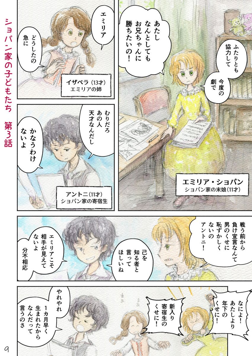 『ショパン家の子どもたち』32pマンガ その3 毎週4pずつ 水彩スケッチ風に描いてます 次回は2月6日(月)の12時更新です #ショパン家の子どもたち #エライ人の子ども時代を想像する #コルクラボマンガ専科 #週刊マンガ専科 #マンガが読めるハッシュタグ #水彩 #マンガ #絵本 #ショパン #子ども