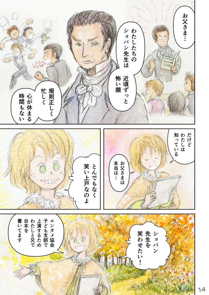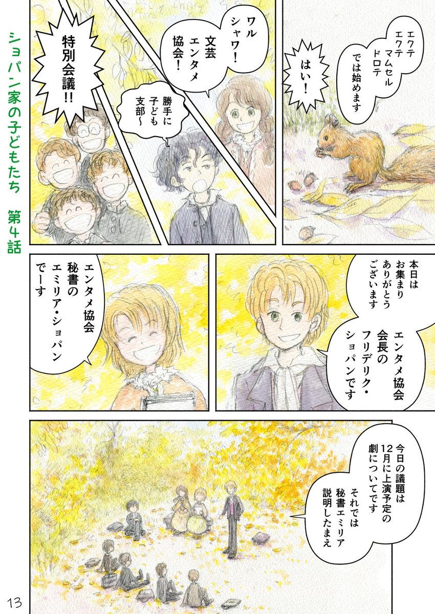 『ショパン家の子どもたち』32pマンガ その4 ワルシャワ文芸エンタメ協会・勝手に子ども支部、秋の特別会議の様子。 次回は2月13日(月)の12時更新です #コルクラボマンガ専科 #週刊マンガ専科 #マンガが読めるハッシュタグ #水彩 #マンガ #絵本 #ショパン #子ども