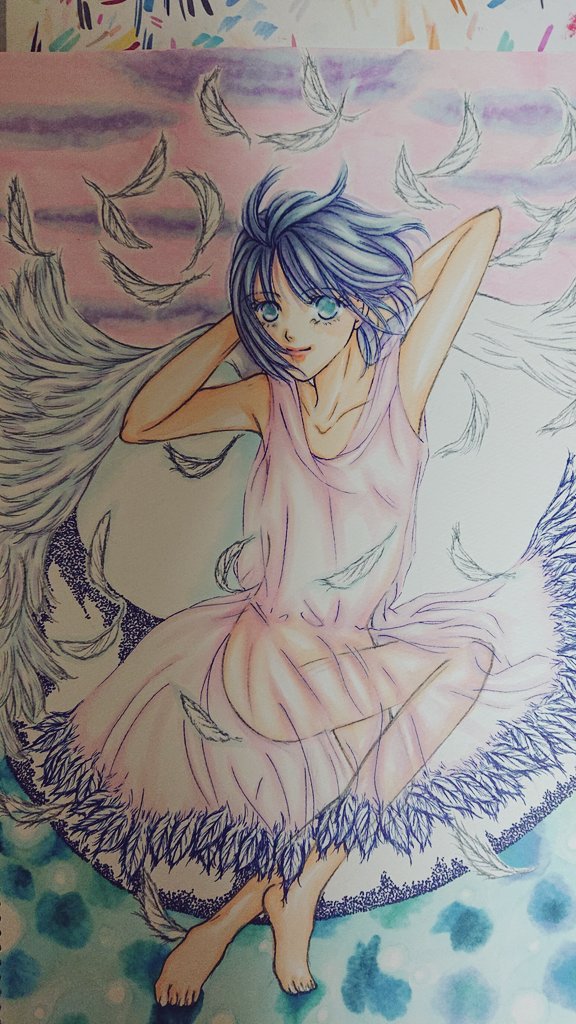 #アナログ絵を流してアナログ民を増やそう #コピックイラスト #進捗どうでしょう2022 #天使 🍀7割完成してます✨( * ॑꒳ ॑* )✨ よく観ると✨リリちゃんの両足の向き逆🙃なんやけど💦イメージが 沸いてすぐすぐ描いたからなぁ🤔 天使って中性的だと思うし✨まっ いいか😆BGMは玉女のGRええな🎼