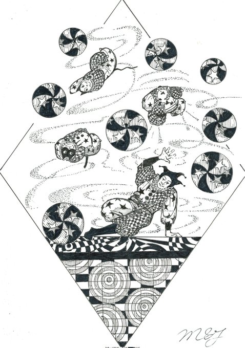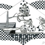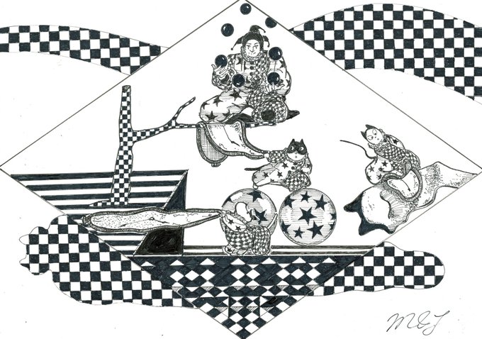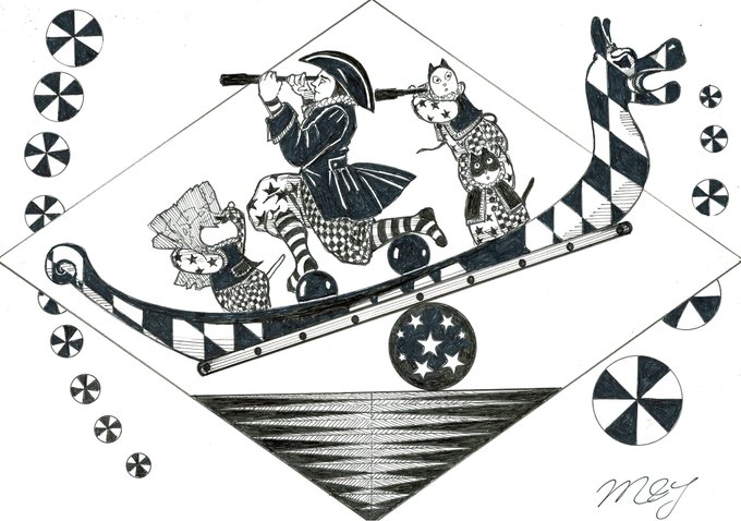 🎈🎈🎈風船🎈🎈🎈 😆🤣道化師たちによる、ゆかいなパントマイムショー by🎪🃏😸😺🐶《道化師と陽気な仲間たち》 #創作イラ #道化師と陽気な仲間たち #オリジナルキャラクター #アナログ #モノクローム #道化師 #猫 #犬 #パントマイム #イラスト #mangastyleillustration #funny #風船