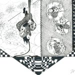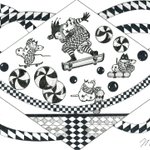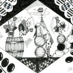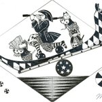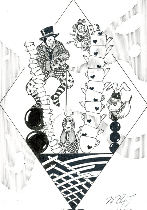 ☕🥮A Mad Tea- Party (気狂いのお茶会、/狂ったお茶会) 📓不思議の国のアリス 😆😆道化師たちによるゆかいなパフォーマンス by 🎪🃏😸😺🐶《道化師と陽気な仲間たち》 #創作イラ #道化師と陽気な仲間たち #オリジナルキャラクター #アナログ #モノクローム #イラスト #不思議の国のアリス