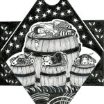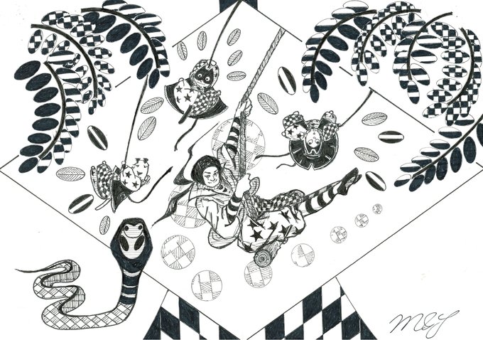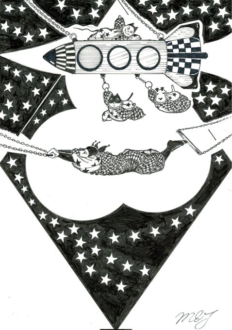 🚀😸😺🐶「僕たちのロケット」🚀 😆🤣道化師たちによる、ゆかいな空中ブランコ by 🎪🃏😸😺🐶《道化師と陽気な仲間たち》 #創作イラ #道化師と陽気な仲間たち #イラスト #アナログ #モノクローム #オリジナルキャラクター #空中ブランコ #ロケット #道化師 #猫 #犬 #funnyillustration