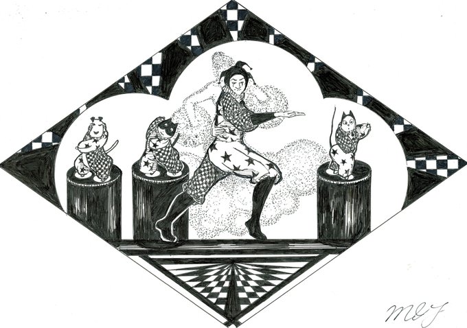 ♦️ポールダンス♦️ 😆😆道化師たちによる、おもしろいポールダンス by 🎪🃏😸😺🐶《道化師と陽気な仲間たち》 #創作イラ #オリジナル #道化師と陽気な仲間たち #アナログ #モノクローム #道化師 #猫 #犬 #ポールダンス #funnyillustration #イラストレーション