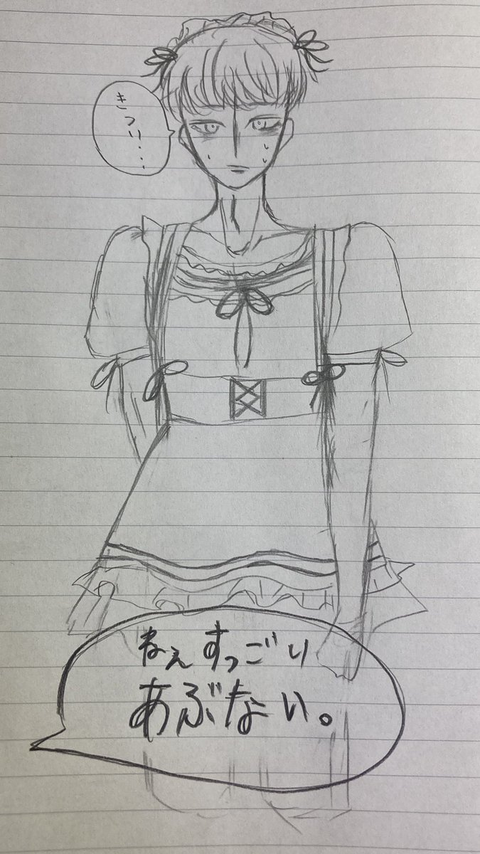 #イラスト #アナログ #イラスト好きさんと繋がりたい #違うそうじゃない #メイド男子が見たかっただけなのに 今日クラスの男子とガトーショコラ食べてたら急にスカートの構造について語られて、 「履いてみたいんだよね」と言われて 長年メイド男子見るのが夢だったので着せたらなんか違った。