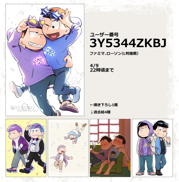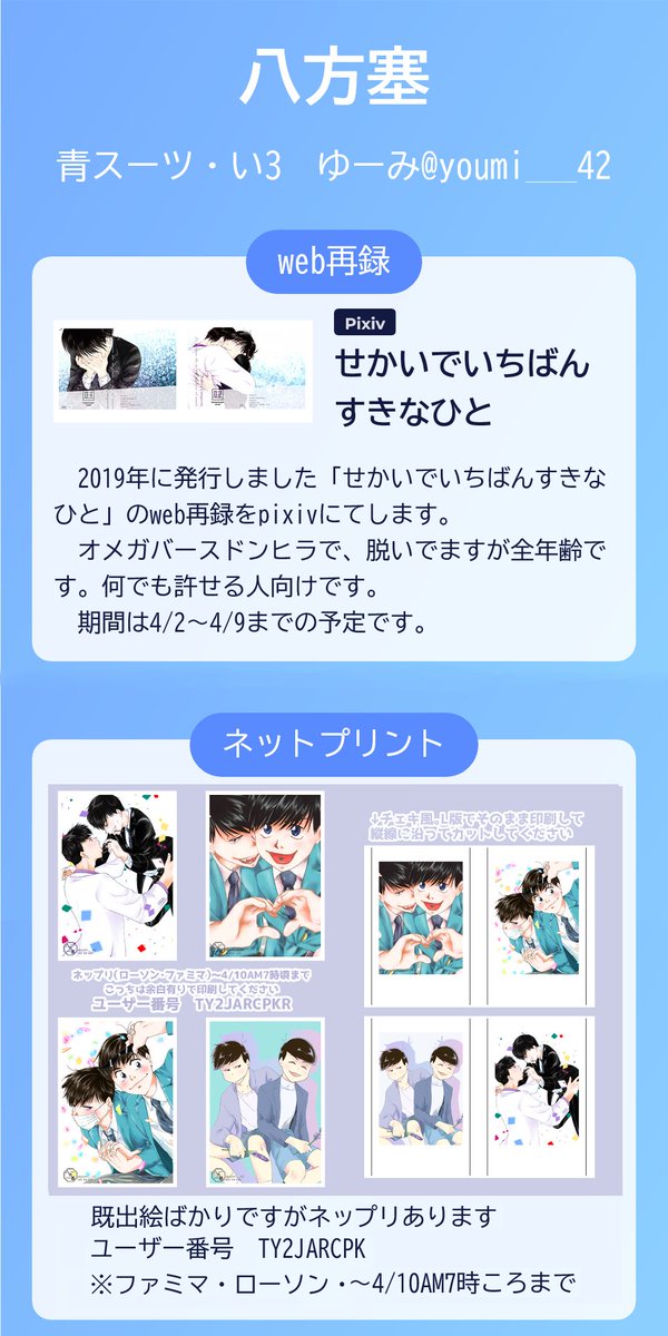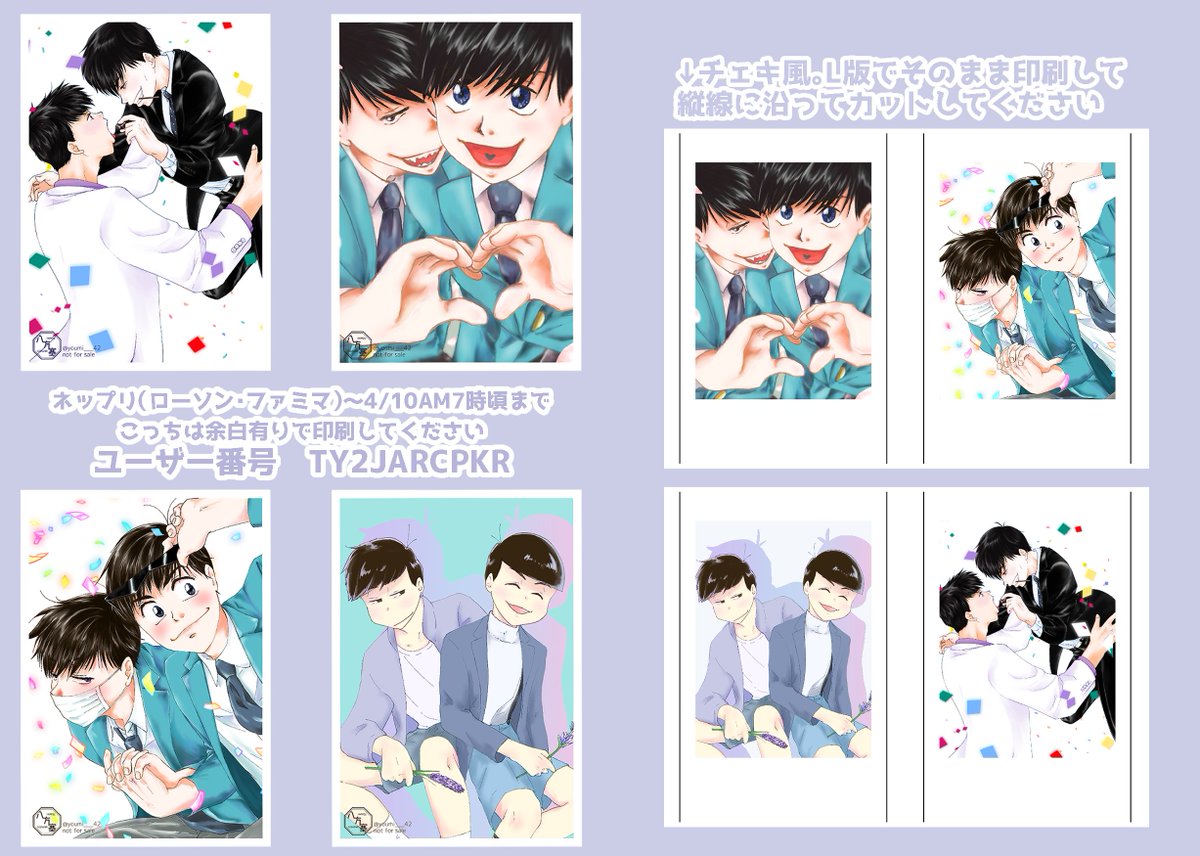 イベント開催おめでとうございます!!👏👏 web再録で「せかいでいちばんすきなひと」を支部に→pixiv.net/artworks/10677… ネットプリントもご用意しました。(ローソンファミマ、10日7時頃まで) ユーザー番号TY2JARCPKR チェキ風はそフチなし印刷、L版はフチあり印刷推奨です #遠い地からパーリナイ