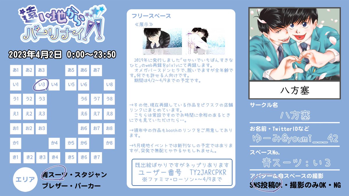 5/3家宝遠い地からパーリナイ!ぶんぶくちゃがまお品書きです。 詳しくは支部に↓ pixiv.net/artworks/10743… 新刊サンプル↓ pixiv.net/artworks/10677… 42初本です。無配もございます( * ॑꒳ ॑*)♡よろしくお願いいたします🎵 一カラ 42 💜💙 #遠い地からパーリナイ