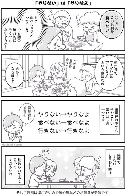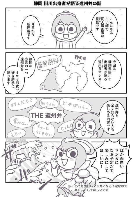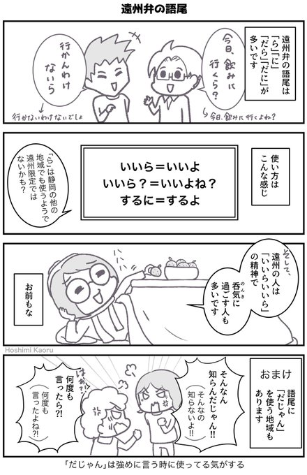 今日から新連載です!テーマは静岡の方言の一つ「遠州(えんしゅう)弁」 故郷の言葉である遠州弁について、4コマ形式で語っていきます。 このマンガを通してぜひ遠州弁マスターを目指してください笑 #漫画が読めるハッシュタグ #星見の静岡遠州弁マンガ #静岡 #遠州弁 #方言