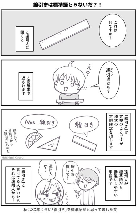遠州弁マンガ⑥ 私は「線引き」が標準語でないことを、いまだに信じられていません🤣 私は「定規」と言われると、定規全般を指す気がしてしまうんですよね。 解説はこちら↓ note.com/hoshimi09/n/n7… #漫画が読めるハッシュタグ #星見の静岡遠州弁マンガ #静岡 #遠州弁 #方言 #静岡弁