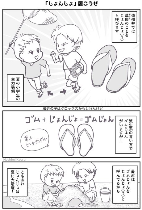 静岡 遠州弁マンガ⑩じょんじょ みんな大好き「じょんじょ(う)」。 私も小学生の頃は毎日じょんじょ履いて出かけてました。 おかげでじょんじょの形に日焼けしたりも笑 解説はこちら↓ note.com/hoshimi09/n/nd… #漫画が読めるハッシュタグ #星見の静岡遠州弁マンガ #静岡 #遠州弁 #方言 #静岡弁