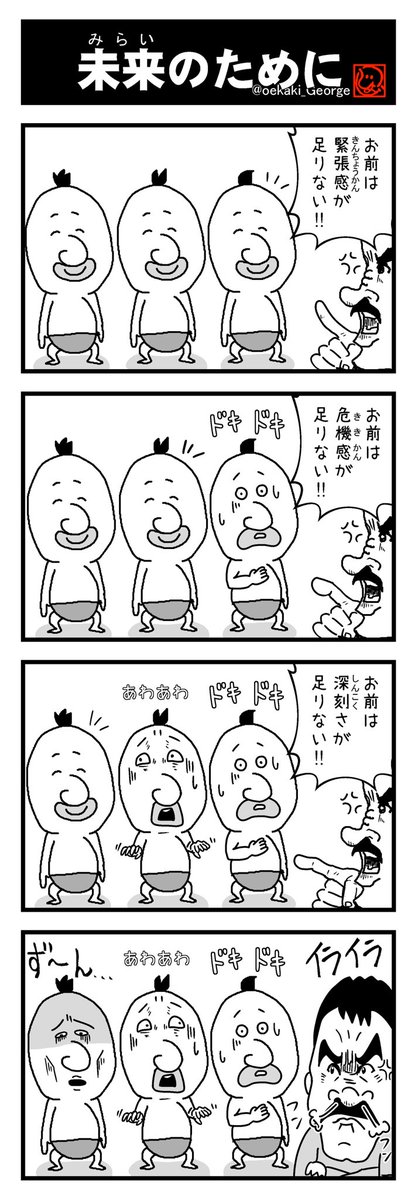 緊張感と危機感と深刻さを持って事態に対処しましょう! いつか知らないけど安心できる未来の為に! #ジョージの4コマ No354 「未来のために」 #4コマ #4コマ漫画 #コロナ #選挙 👼不定期メルマガ resast.jp/subscribe/1477… 💡イベント、最新情報一覧 smart.reservestock.jp/consecutive_ev…