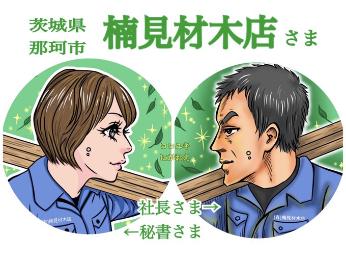 #茨城県 #那珂市 楠見材木店さんの 社長様 @yoshihiro_zaimo 秘書様 @hmoooo1515 描かせていただきました! 色々なことをしていて面白い会社だと思っていましたが、にがおえのリクエスト内容がまた面白くて…流石だなぁと😂 材木屋さんが作る雑貨は 天然の木、ヒノキの温もりで かわいくて素敵♡ twitter.com/yukinoko2020/s…