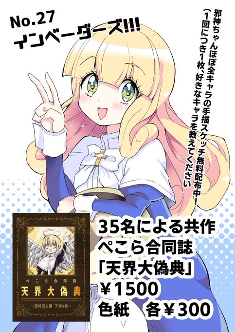 【5/4 邪神ちゃんフェス】 No.27 インベーダーズ 頒布物 ぺこら合同誌「天界大偽典」 ¥1500/164P 色紙(全40種予定、大体ぺこら) ¥300 ※おひとり様1枚まで 邪神ちゃんのキャラクターのスケッチ 無料 ※1並びにつき1枚プレゼントします (続) #邪神ちゃんドロップキック #邪神ちゃんフェス