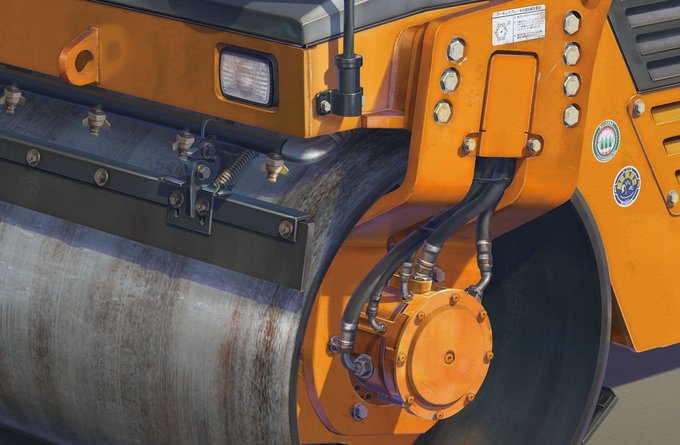 どれもフォトショップで描いた2D絵です ●建機農機等は筆跡を排してひたすらディテール描きこみ ●船舶は水彩筆で描いたような粗削りなタッチをなるべく残す ●飛行機は上記二つの中間くらい ......という感じで描き分けてます。 #部分撮りでぶち抜け