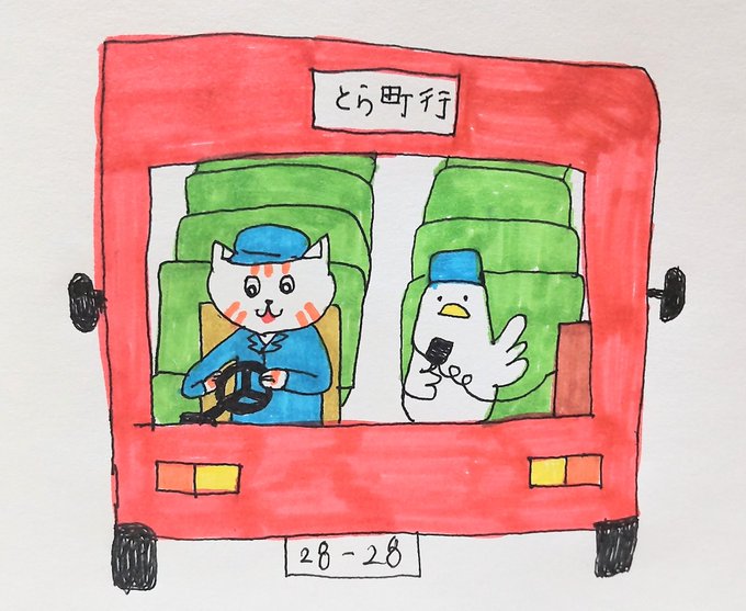 おはようございます!! (#都バス開業の日 ) ことら運転手と、ニワちゃんバスガイド、 ニワちゃん無言って事は無いよね😅 今日も素敵な火曜日を〜😆 #イラスト好きな人とつながりたい #絵描きさんと繋がりたい #みんなで楽しむTwitter展覧会 #イラスト