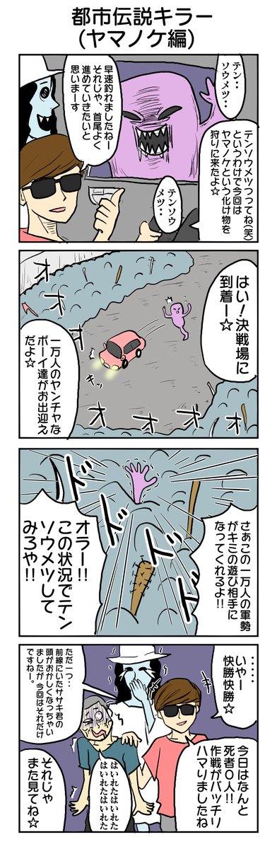 都市伝説キラー。「ヤマノケ」は初めて読んだ時めちゃくちゃ怖くて泣いちゃった思い出があるのでボコっておきました!🤓👍380本目。 #4コマ1000本ノック #4コマ漫画 #都市伝説キラー #ヤマノケ #はいれたはいれたはいれたはいれたはいれたはいれたはいれたはいれたはいれた
