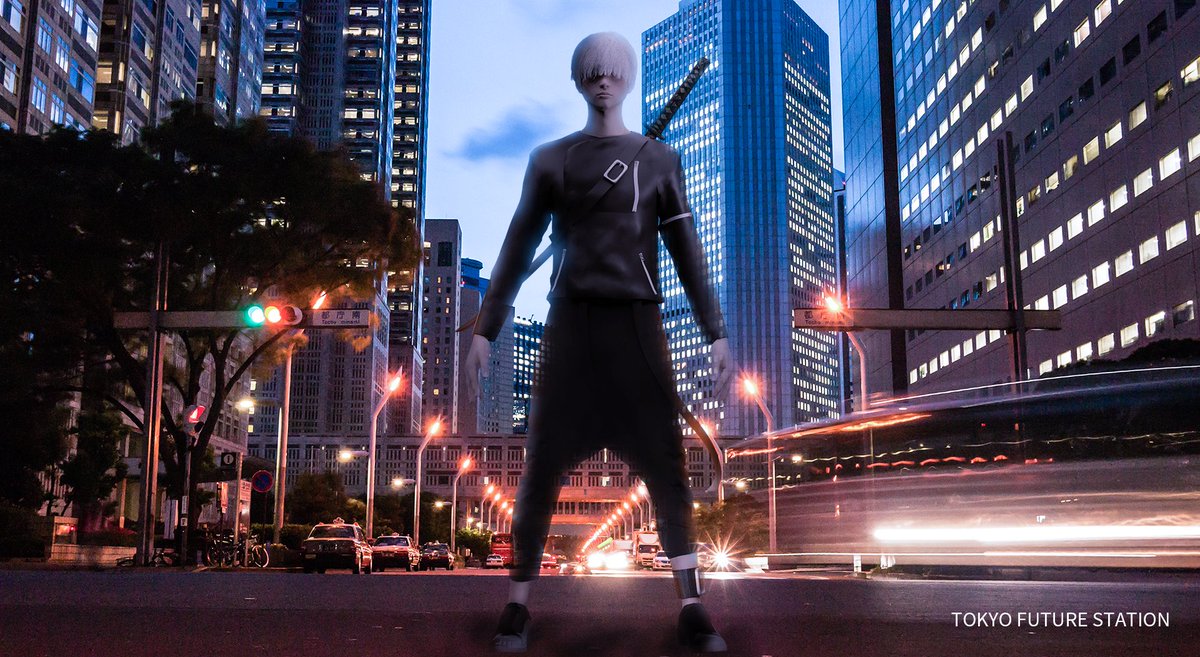 銀髪のおにいさんが、刀を持って、都庁の道路の真ん中で仁王立ちしている絵を作りました。人物はCGで作っています。服はCLO 3Dで作りました。人物はなかなか難しいです😂 #絵師さんと繋がりたい #イラスト #デジタルイラスト #絵 #絵描きさんと繋がりたい #都庁 #東京