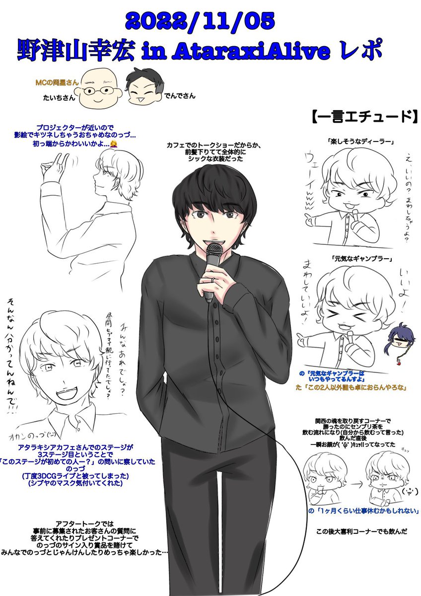 #野津山幸宏 in #AtaraxiAlive レポ描いてみました!! めっちゃお客さんにフレンドリーにお話してくれたり芸人顔負けのトークを繰り広げていたのっづ…すごい… MCの岡星のお2人も芸人1年目の方とは思えないくらい面白かったです!😆 また大阪でこの3人でトークショーしてほしい…