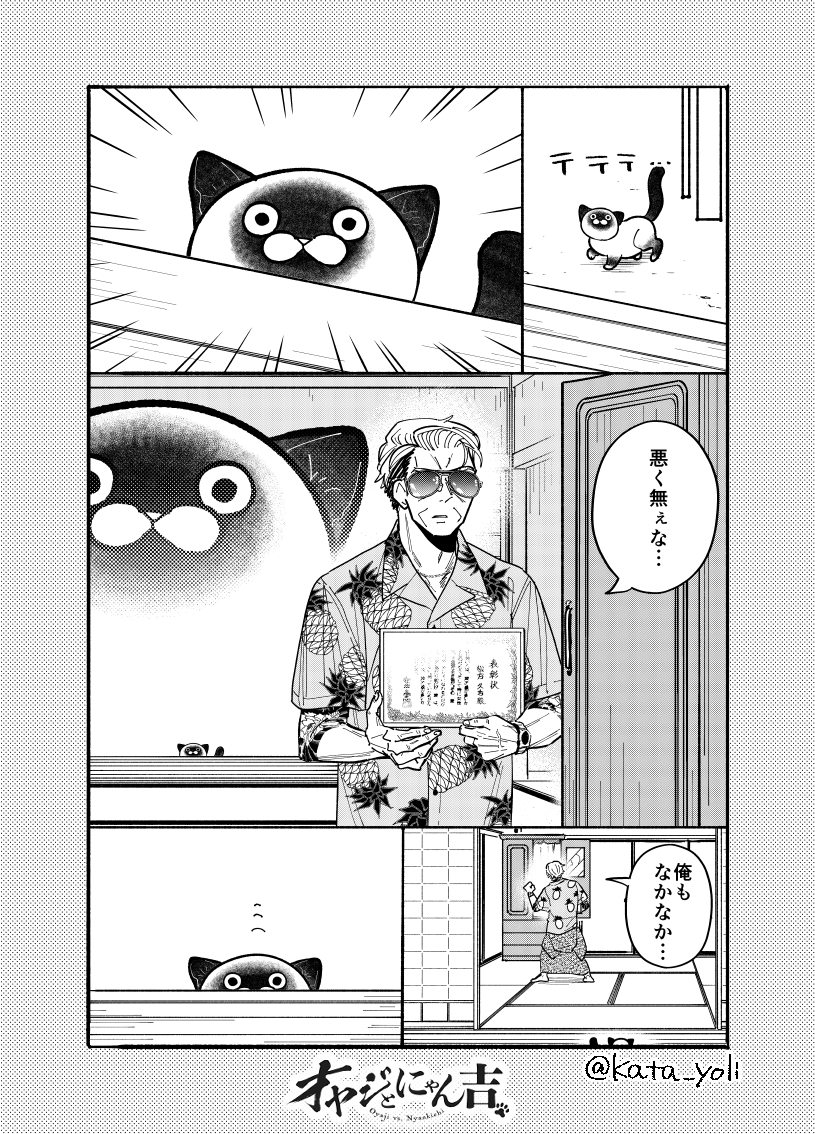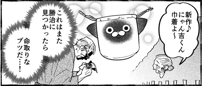 「#オヤジとにゃん吉」👨🦳🐾🐱 12話おまけが更新されま 🐾した! お隣の原田さんの新作に🐾既視感…? 🐾 コミック1巻発売中です 🐾 よろしくお願いします! 🐾 #猫 #野良猫 #猫のいる暮らし #漫画が読めるハッシュタグ sunday-webry.com/episode/485600…
