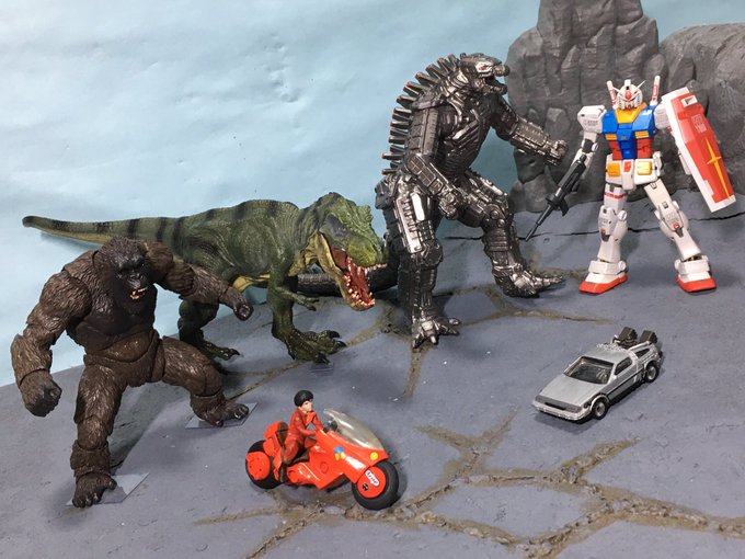#夜のフィギュア撮影会 お題『子』 レディプレイヤーワン!子供たちが大好きなキャラクターが夢の共演! #レディプレイヤー1 #レディプレ #ReadyPlayer1 #キングコング #ティラノサウルス #金田のバイク #メカゴジラ #ガンダム #デロリアン