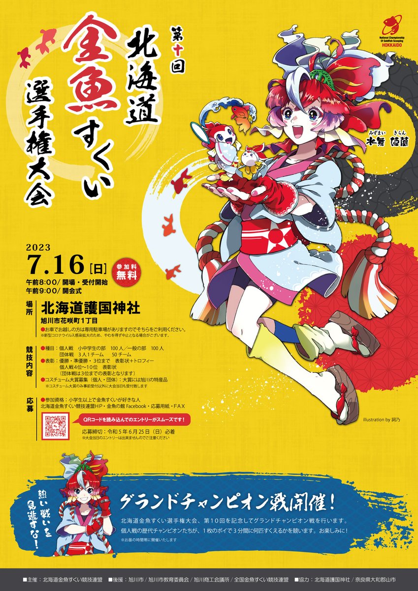 【ご報告】 昨年に引き続き、今年も旭川で開催されます「北海道金魚すくい選手権大会」のポスター制作させていただきました!第10回という記念大会…姫蘭ちゃんの新規立ち絵も描かせていただきました🥳✨ また旭川などでポスター発見されましたら、是非ご覧ください♪ #金魚の館 twitter.com/gold_fish_club…