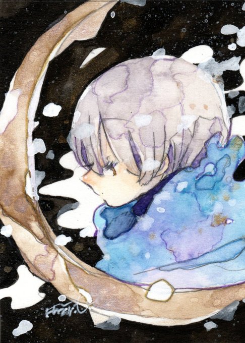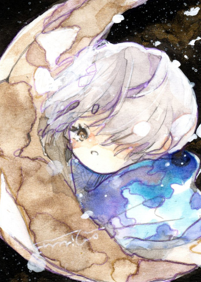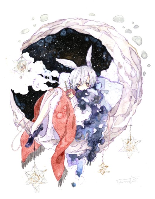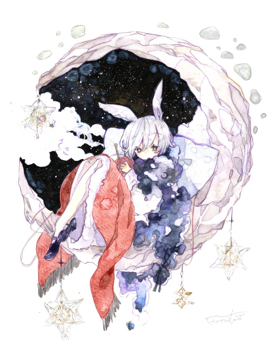 『紡ぎ』 三日月に住むうさぎが 夜空に編み込む星の輝き。 流れ星の行く先で 君と待ち合わせをしよう。 2021.10 クローゼットと宵の月展出展 #針子イラスト倉庫 #クローゼットと宵の月