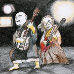 人間椅子カルタ その32 ろ ろーりん♪ろーりん♪ろーりん♪ろーりん🎵 #人間椅子 #ナカジマノブ #和嶋慎治 #鈴木研一 #みんなで楽しむTwitter展覧会 #色鉛筆画 #シンバル描き忘れた