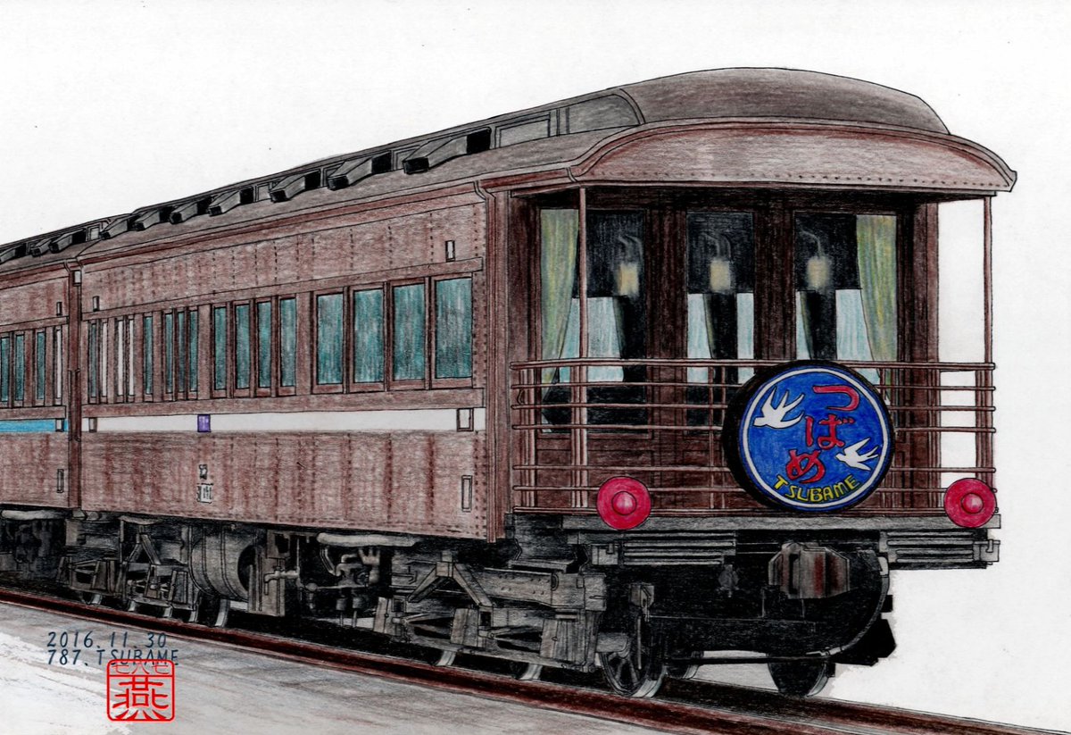 1930(昭和5)年、超特急「燕」運行開始。まさに満を持しての登場です。列車の最後尾を飾る白帯を巻いた一等展望車はほぼ、政治家や高級軍人の専用車だったということ。垂涎の的だったんでしょうね。 #鉄道開業150周年オンライン個展 #鉄道開業150周年 #色鉛筆画 #鉄道イラスト