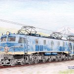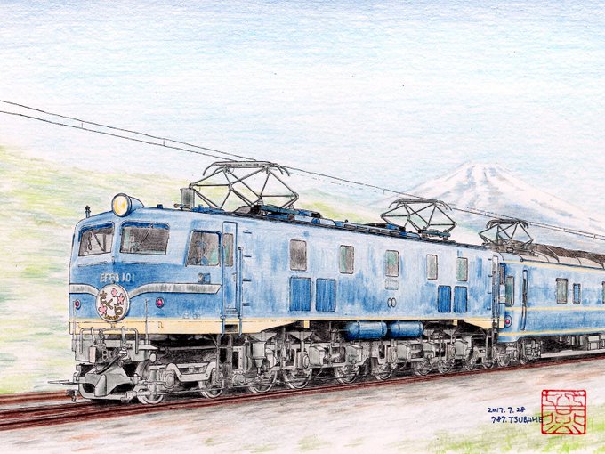 電化の伸展に伴って、それでもまだ客車や貨車が多かった国鉄は、電気機関車も多数、新製しました。 最後の旧型電気機関車 #EF58 オリジナルはデッキ付きの古式蒼然としたデザインでしたが、流麗な車体に載せ替えられました。 #鉄道開業150周年オンライン個展 #鉄道開業150周年 #色鉛筆画 #鉄道イラスト