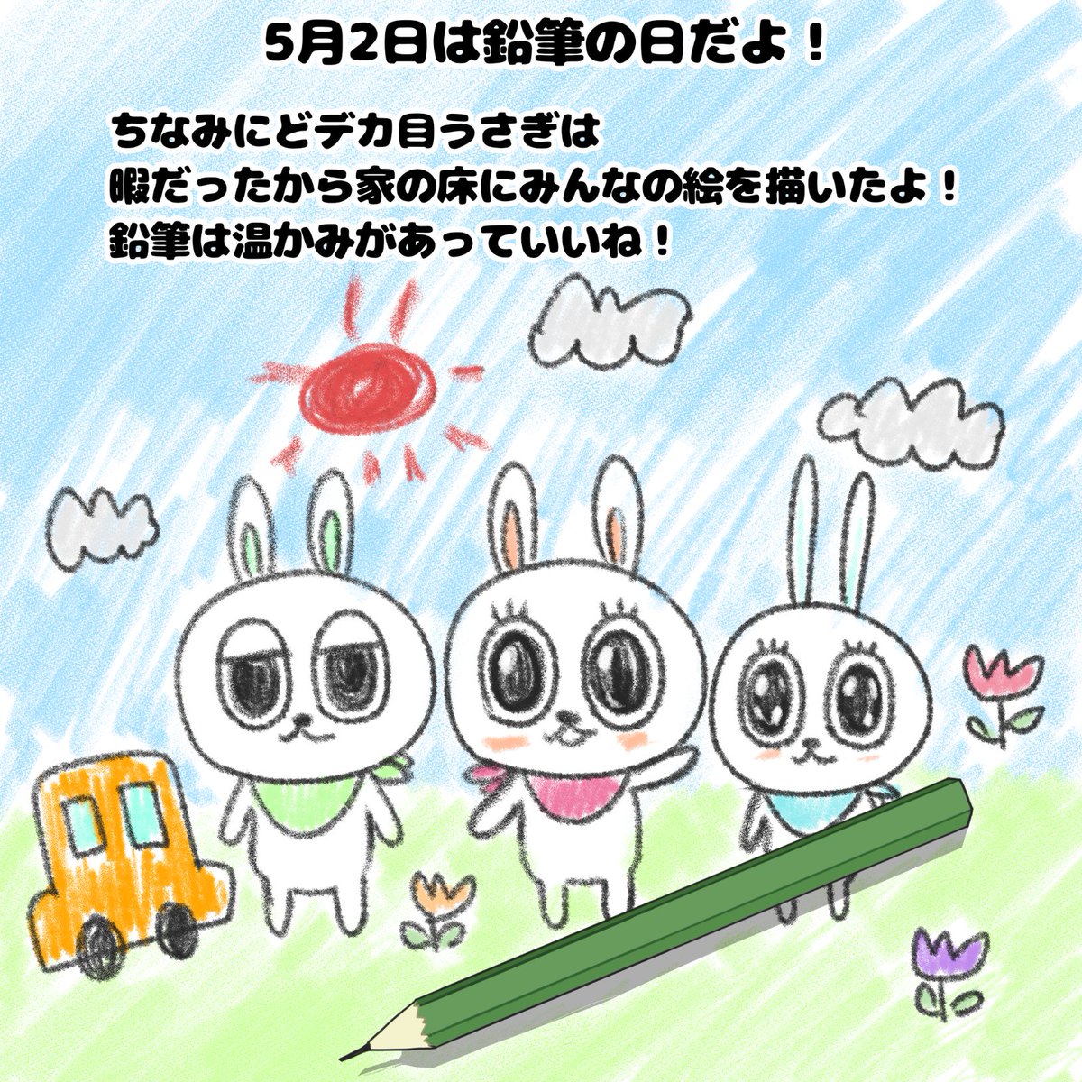 おはようございます✨ どデカ目うさぎは鉛筆でお絵描きしたみたい📝何を描いたのかな❓ #イラスト #どデカ目うさぎ #イラスト好きさんと繋がりたい #illustration #みんなで楽しむTwitter展覧会 #鉛筆の日