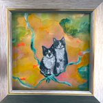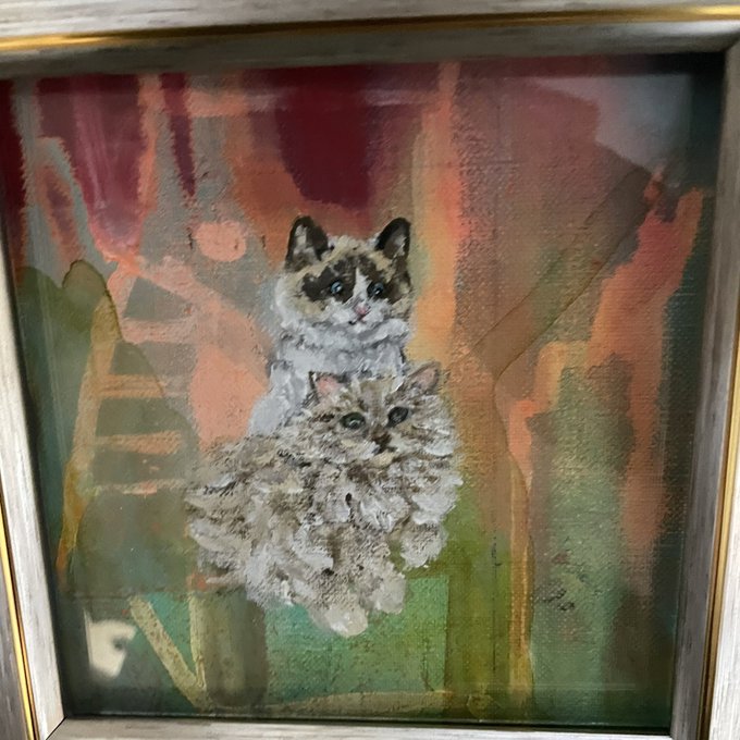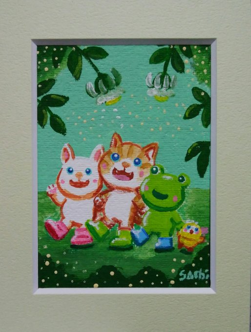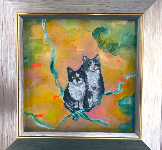 銀座中央ギャラリー 「ATCサイズ展」10日(土)まで 作品紹介 「おさんぽ」 手のひらサイズの小さな世界 仲良し3人ゆったりおさんぽ中😺🐸 昭和レトロなビルにあるギャラリーにお立ち寄り下さい✨ #銀座 #銀座中央ギャラリー #ATCサイズ #ミニ額 #猫イラスト #猫好き #イラスト #illustration