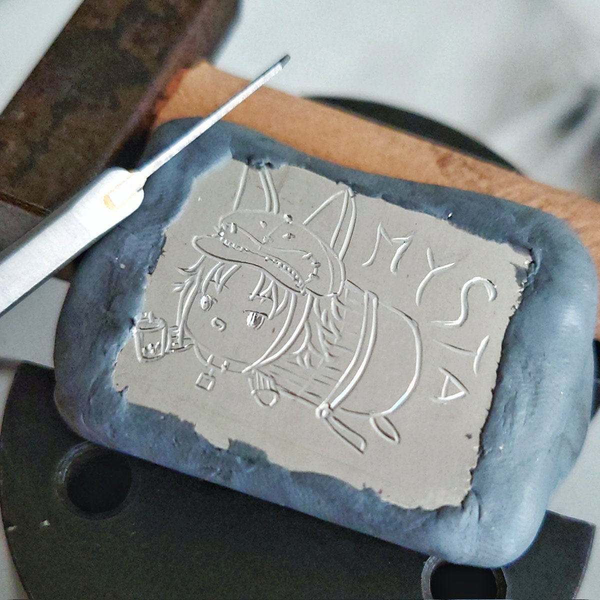 Draw Vox on silver plate by engraving Vox cooks for you in Luxiem Cafe #tyoukin_acg #vox #voxakuma #akurylic #luxiem #銀板彫金 #彫金 #engraving